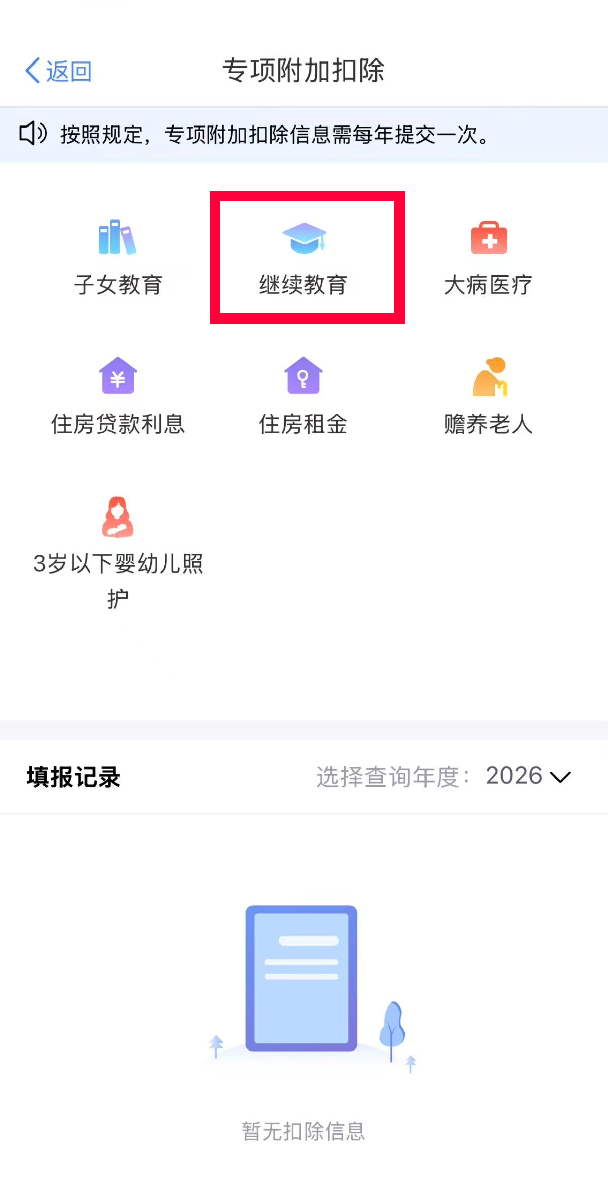 2.在专项附加扣除中选择“继续教育”,抵扣年份选2026,并点击“确认”。