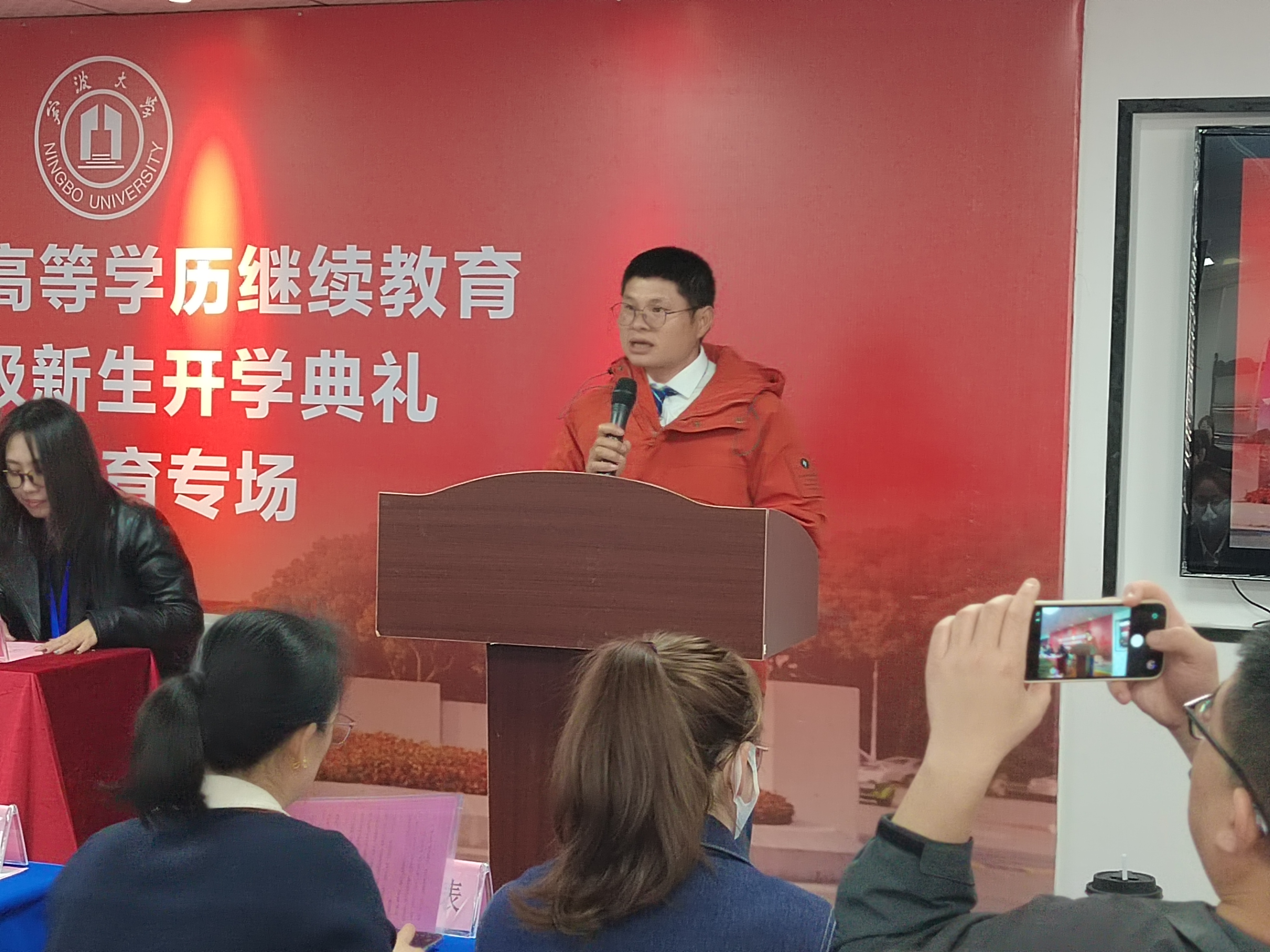 宁波大学育成教学点辅导教师俞建萍老师上台发言。俞老师娴静温婉、平易近人,深受广大师生喜爱与认可。她将以耐心细致的陪伴、专业悉心的指引,助力各位新同学快速融入浓厚的学习氛围。相信在俞老师与全体教师的陪伴下,新生定能逐梦前行、学有所成!